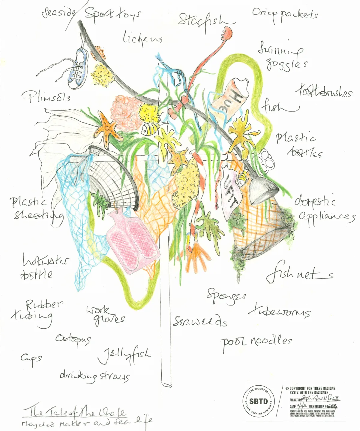 The visuals for Britten Sinfonia’s The Tale of the Whale came from seeing this image. They show sea creatures and plant life living amongst plastics, some strangled by contact but others showing resilience and resistance. Ironically they are realised with soft, synthetic foam, plastics and fabrics (as far as possible recycled) - bright, neon, reflective and textured materials creating tentacles, seaweed, sponges, lichens and such, squeezed and growing between identifiable washed-up objects. I wanted to capture something of the glowing light in Padmacandra’s underwater illustrations, using fibre-optic lights threaded around the creatures, plants and detritus.